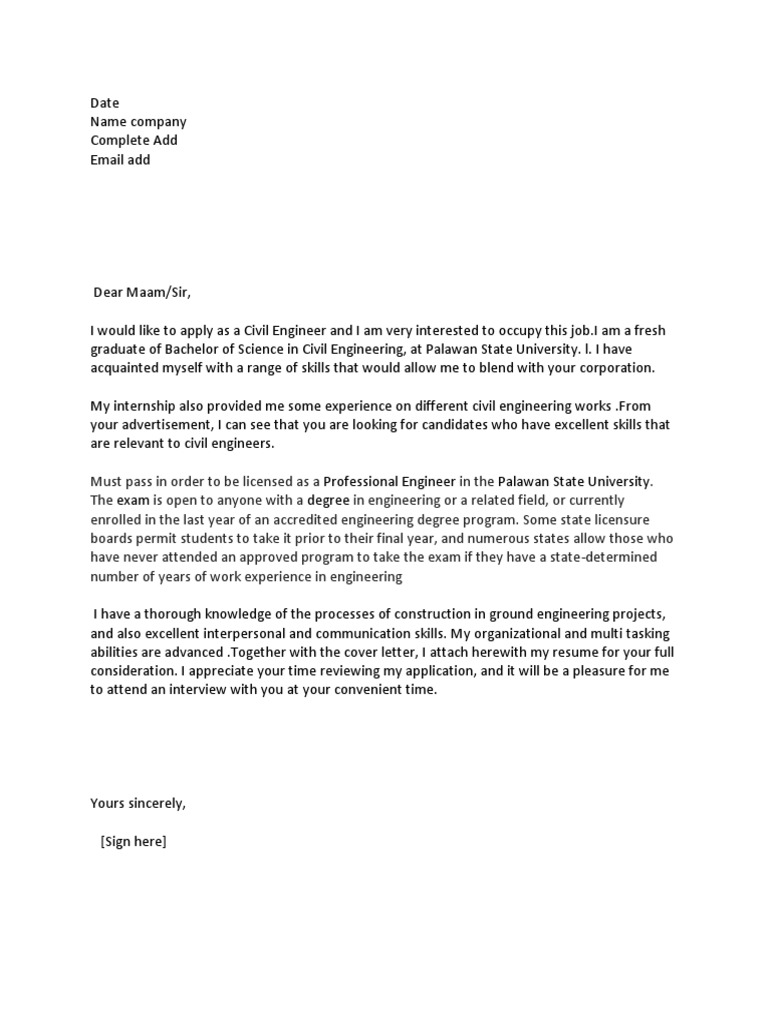 Teamwork with managerial and technical knowledge is a must in the construction industry. An application letter is one of the first few things that you need to prepare when applying for a job. A job application letter, also known as a cover letter, should be sent or uploaded with your resume when applying for jobs. In search of new thoughts is probably the fun activities however it can be cover letter internship civil engineering collection application with application letter sample for fresh graduate computer science19656. Excellent report writing and verbal communication skills. Hiring managers and potential interviewers have certain expectations. English verbal and written excellent knowledge. Graduate covering letters for civil engineering, construction and quantity surveying jobs. I am a fresh graduate of bachelor of science in civil engineering, bohol island state university. Your job application letter is your key to get that job you are applying for. A proven job specific resume sample for landing your next job in 2020. For those who are applying for a job, you might want to consider using these letter of application samples. For top civil engineering jobs, you need a cover letter that promotes both your skills and passion. I am a graduate in civil engineering from osmania university, hyderabad. Lastly, close the sample cover letter by taking the initiative and requesting for an interview. Get inspiration for your application letter, use one of our professional templates, and score the job you. I have attached in this letter my curriculum. At times, the feedbacks could be extremely frustrating and it may not even be your. Browse our database of 850+ cover letter examples and samples written by real professionals who got hired by the world's top employers. Searching for samples of job application letter? A job application letter is used to identify and select suitable candidates for a particular position. Your application letter, together with your resume, are two of the most important documents you need in your bid to get a job. Application for the role of {sales manager} at xyz ltd. I have been working in the engineering field for several years, and. Cover letter examples for all types of professions and job seekers. Getting experience is hard, but that's what internships are for. Teamwork with managerial and technical knowledge is a must in the construction industry. 6:31 andrew lacivita recommended for you. A fresh graduate of civil engineering seeking a challenging yet rewarding job position in a progressive organization that will provide an opportunity to utilize my technical skills and ability in an engineering capacity. Create the best version of your entry level civil engineer resume. Practical application of engineering science and technology.