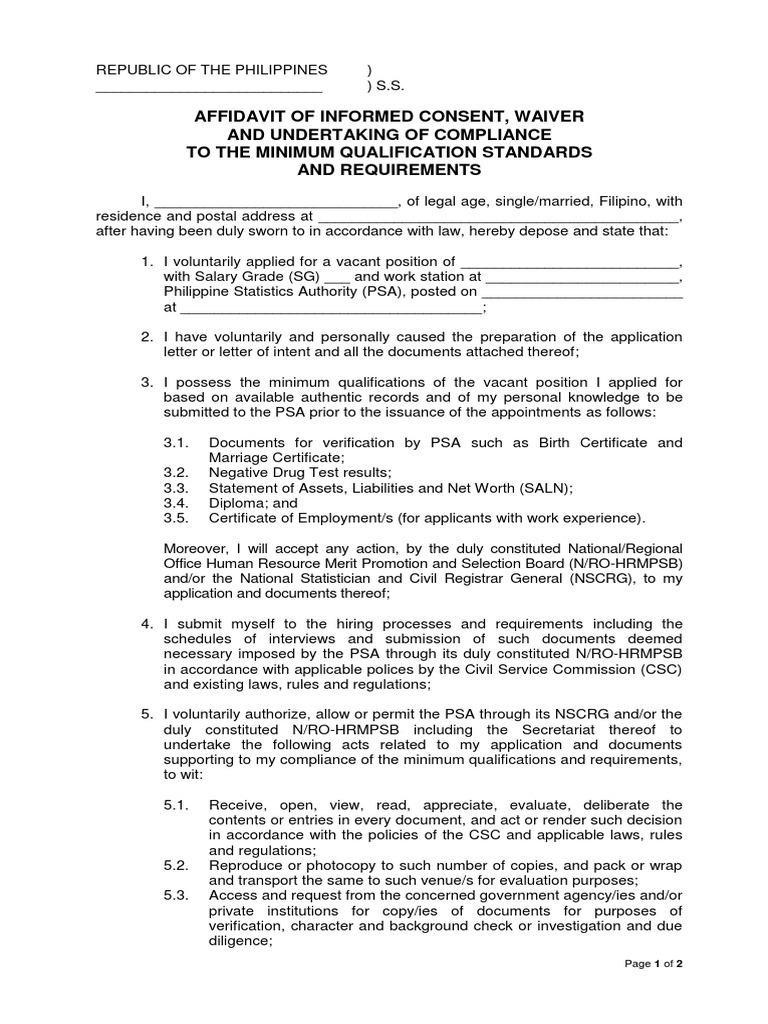 - Affidavit Of Informed Consent Waiver And Undertaking Of Compliance To The Minimum Qualification Standards And Requirements 1 Docx Affidavit Verification And Validation - Application Letters Should Be Drafted Carefully And Should Convey The Meaning Of The Letter In A Positive Manner.