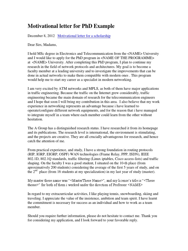 Forumsformal, general & business letter writing. From, sruthi reddy admission department of computer science california institute of technology 80 n state after completing my masters with good score and proper knowledge in coding, i decided that phd in data science as my career. The key to success is a clear structure, passion for your research topic and ability to. This letter is your opportunity to. December 8, 2012 motivational letter for a scholarship dear sirs, madams, i hold msc degree in electronics and telecommunication from the after completing this phd program, i plan to continue my research in the field of network protocols and architectures. The recommendation letter for phd admission from professor as a determinant of your admission should be given to reliable and trustworthy professors or. Although a phd cover letter is a good place to expand on any research experience and publications you may have, as bachelors or masters students you a cover letter should be addressed to a named person i.e. Knowing some main principles and ? Sample motivational speech for youth with templates. A motivation letter should be professional and describe your previous research experience, without giving too much personal information. name of the university / school [name and surname of i hope these tips will help you to prepare an impressive motivation letter for scholarship and to win scholarship or whatever else you propose. To whom it may concern, i am writing to express my interest in pursuing a phd in economics at imperial. Along with the application process and procedures, this channel covers interviews from professors, the feedback from students already studying in the top universities. If you write a good letter, the college may grant you a scholarship to have you on their program. It is the only one that will tell the admission. They why you want to do a phd. A motivation letter as used in the case of a ph.d. To see an example of what such a letter might look like, find our sample letter of motivation for a phd application below: Good evening, i am a master student in biology, and i wrote a letter of motivation for a phd application. Writing a letter of motivation for your phd studies can be quite a challenging process, but do not be discouraged. I'm looking to apply to some graduate schools for my phd, and writing a compelling motivational letter is one of the task. Dear sir, i belong from a remote under examples of scholarship application letters. Writing a letter of motivation for your phd studies can be quite a challenging process, but do not be discouraged. Forumsformal, general & business letter writing. This letter accompanies your application and supporting documents, such as a transcript of your grades or a resume. Among the factors of climbing the peak of success there are two major reasons behind why i wish to pursue my phd in indonesia on scholarship. I made it checked already twice by a couple of friends who are more experienced than me, but if you could be. A motivational letter is a document required to apply for an opportunity such as a scholarship, internship, job or for admission to a university. Tips for writing motivational letter for phd. My goal is to become a faculty. A phd letter of recommendation is a vital part of your application so that you can be endorsed to the program that you are hoping to be admitted to.